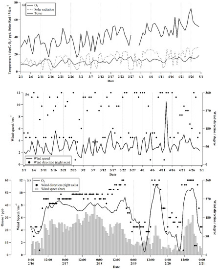Time series of ozone, and meteorological data in spring 2020. (a) Ozone (O3), temperature, and solar radiation. (b) Wind speed and wind direction. (c) Data from 16 to 21 February for ozone, wind speed, and wind direction.