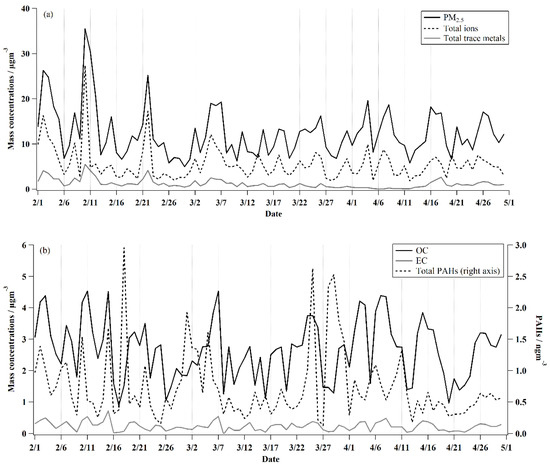 Time series of mass concentrations of PM2.5 and its chemical component in spring 2020. (a) PM2.5, total ions, and total trace metals. (b) OC, EC, and total PAHs.