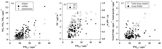 As mentioned earlier, the concentration variations in PM2.5 and each chemical component are different from time to time, then the correlation was plotted for ionic components (sulfate, nitrate, ammonium), EC, OC, total trace metals, and total PAHs with respect to PM2.5 concentration, which is shown in Figure 4. The concentrations of ionic components, EC, OC, and total metals increased with increasing PM2.5 concentration, and their concentrations are considered to vary in the similar manner (Figure 4a–c). The EC and OC, both of which contain carbon, correlate to each other as shown in Figure 4b. Although we do not know the reason, both EC and OC seem not to increase when the PM2.5 concentration is higher than 20 μgm−3. EC concentrations tend to be higher when wind speeds are low (not shown in Figures). This is presumably because local emissions become stagnant at low wind speeds. As shown in Figure 4c, PAHs tend to increase when the concentration of PM2.5 is low. The variation in PAHs is different from PM2.5 and other chemical components. The correlations revealed that PAHs have a slightly different trend from other chemical components.