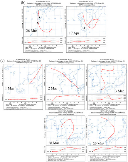Typical examples of days with high concentrations for almost all components are 2–3 and 10–11 February. The maps of backward trajectory are shown in Figure 5a. The air masses reached Fukuoka from southern Korea, from the Shandong Peninsula through the northern East China Sea, or from northern China through the Yellow Sea. The backward trajectory suggests that transboundary air pollution from the Asian continent influences the Fukuoka air quality, which was seen before in Fukuoka [7,8,9]. Since Fukuoka is located in the western area of Japan, the seasonal monsoon prevails in the winter-spring season. The weather chart provided by the Japan meteorological Agency showed that a high-pressure system remained in the East China Sea area on 2–3 and 10–11 March, which is a typical atmospheric pressure pattern in winter season, and northerly wind prevails under this pattern. Then, the air pollutants emitted in the Asian continents are transported to Japan, especially in the west part of Japan [2,3,4,5,6,7,8,9]. However, local influences are also likely to affect the Fukuoka air quality. This is probable because the population in Fukuoka is about 1.5 million, and there are seaports and airports near the city in addition to the large industrial and commercial area. Therefore, the local emissions from the city itself affects the air quality in Fukuoka. The ozone shows diurnal variation and the wind direction indicates a sea-land wind pattern on those days [9,22,23], suggesting that the local emissions also affect the local air quality.