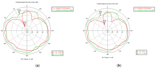 Conversely, the 2D- and 3D-radiated beam patterns from the monopole WAVE antenna with quadruple closed-loop devices on the shark-fin module (in Figure 1c) are shown in Figure 6. The 2D null value comparison of monopole-only (red color) and monopole with quadruple closed-loop devices (green color) at angles of 80°, 85°, and 90°, respectively, is shown in Figure 7a–c. At 80°, the null value is enhanced from −30.8 to −4.7 dBi. At 85°, the null value is enhanced from −26 to −5.5 dBi, and at 90°, the null value is enhanced from −21 to −6 dBi. From these simulation results, the monopole-only antenna has a serious null point when installed on the shark-fin module. However, the proposed antenna, a monopole with a closed-loop device, has an omnidirectional beam pattern without a null point.