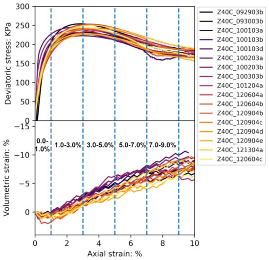 The authors formulated an experimental design to specify the method for conducting a statistical analysis toward boundary kinematics. This consists of five strain levels, comprised of 0.0% to 1.0%, 1.0% to 3.0%, 3.0% to 5.0%, 5.0% to 7.0%, and 7.0% to 9.0%, selected as incremental steps as shown in Figure 1. The first two axial strain levels are associated with the elastic and hardening phases of the material’s response. The peak stress was reached at approximately 3.0% of axial strain for most of the tests, subsequently the stress-strain responses showed softening until 9.0% of axial strain that presented with the onset of the critical state.