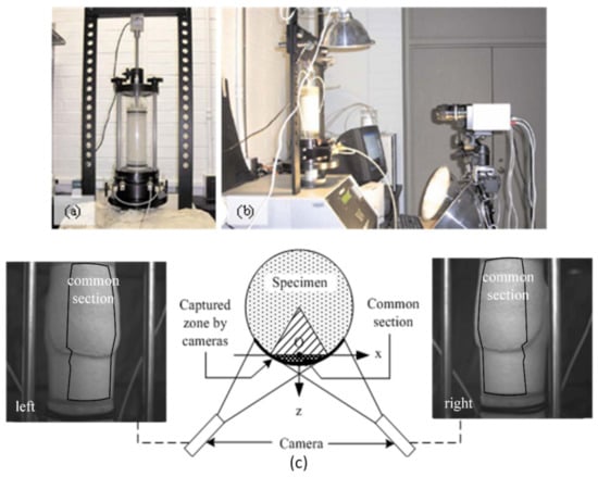Figure 2. The experimental setup: (a) triaxial compression system; (b) the 3D-DIC system; (c) a schematic illustration of a common section captured by two camera systems.