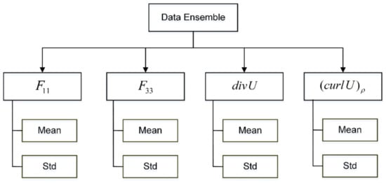 Figure 6. Experimental design: four kinematic properties—gradient along the ρ ^ axis ( F 11 ), gradient along the y ^ axis ( F 33 ), divergence ( d i v U ), and curl along the ρ ^ axis ( ( c u r l U ) ρ )—were calculated on all 3D-DIC-sampled displacement fields, and used for subsequent statistical characterization.