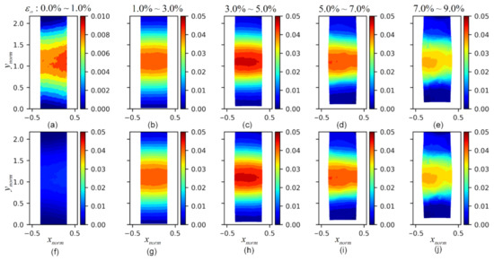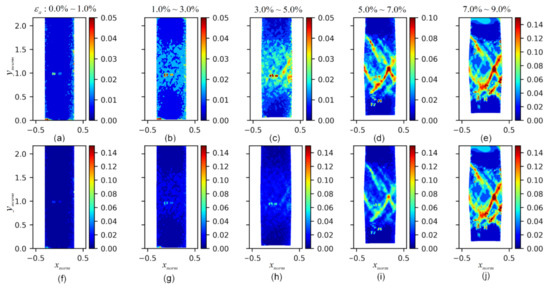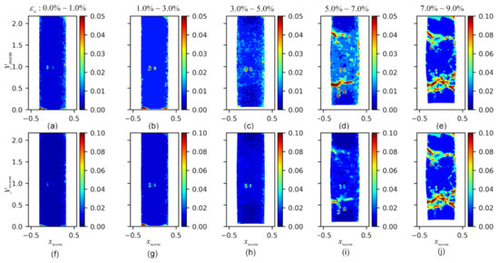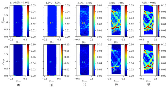 Figure 14. The evolution of the standard deviation fields of ( c u r l U ) ρ : (ae) the standard deviation fields of ( c u r l U ) ρ at axial strains of 0.0–1.0%, 1.0–3.0%, 3.0–5.0%, 5.0–7.0%, and 7.0–9.0%, respectively, with varying range colormaps; (fj) the standard deviation fields of ( c u r l U ) ρ at axial strains of 0.0–1.0%, 1.0–3.0%, 3.0–5.0%, 5.0–7.0%, and 7.0–9.0%, respectively, with consistent range colormaps.