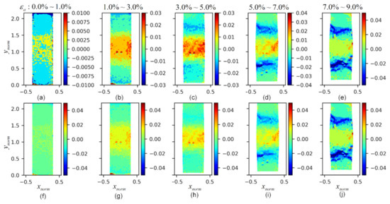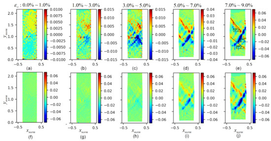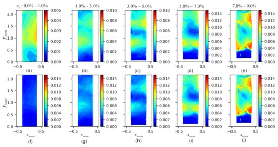 Figure 10. The evolution of the standard deviation fields of the gradient along the y ^ axis F 33 : (ae) the mean fields of F 33 at axial strains of 0.0–1.0%, 1.0–3.0%, 3.0–5.0%, 5.0–7.0%, and 7.0–9.0%, respectively, with varying range colormaps; (fj) the mean fields of F 33 at axial strains of 0.0–1.0%, 1.0–3.0%, 3.0–5.0%, 5.0–7.0%, and 7.0–9.0%, respectively, with consistent range colormaps.