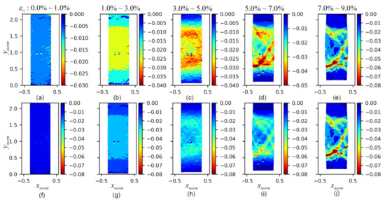 Figure 9. The evolution of the mean fields of gradient along the y ^ axis F 33 : (ae) the mean fields of F 33 at axial strains of 0.0–1.0%, 1.0–3.0%, 3.0–5.0%, 5.0–7.0%, and 7.0–9.0%, respectively, with varying range colormaps; (fj) the mean fields of F 33 at axial strains of 0.0–1.0%, 1.0–3.0%, 3.0–5.0%, 5.0–7.0%, and 7.0–9.0%, respectively, with consistent range colormaps.