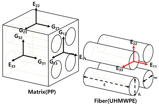 The phrase “composite material” implies that two or more materials with different properties have been macroscopically mixed to become a useful material. These composites have different properties than those of the individual components of the mixture. In a composite material, each component retains its original properties in a mixed state; therefore, the properties are generally present in a non-uniform state from a microscopic perspective. These composite materials can generally be divided into five categories: fiber, particulate, laminar, flake, and skeletal composites. Among them, fiber composites are the most widely used and developed materials. The most recently used fiber-reinforcing agent is carbon fiber (CF), which is mixed with various matrix materials [1,2,3,4,5,6,7,8]. However, these carbon fibers are expensive and have disadvantages. Harmful substances can be generated in the process of mixing these fibers to make a composite material [9,10,11]. To overcome these shortcomings, various alternative fibers have recently been used, such as glass fibers [12,13,14,15,16,17,18]. Glass-fiber-reinforced plastic (FRP) is a composite material made of glass fibers that has been reinforced with synthetic resin as a matrix material. Glass-fiber-reinforced composite materials have a low modulus of elasticity and fewer disadvantages than carbon fiber in terms of strength. Various materials have been developed and used as fibers in order to overcome the disadvantages of fiber-reinforcing agents. Among the most recently used materials, ultra-high molecular weight polyethylene (UHMWPE) is significant. UHMWPE is a type of polyethylene (PE) and is also called high modulus PE (HMPE). PE polymers combine in a long chain with a high molecular weight structure. According to these long polymer properties, UHMWPE does not break even when an external force is applied, and it has the ability to disperse the external force in the direction of the chain. In addition, it has excellent wear and corrosion resistance. Therefore, many studies are being conducted to replace it with composite materials in which steel is used as an additive [19,20,21,22,23]. Since its invention in the 1950s, UHMWPE has been widely used in ships (ropes and sails for yachts), automobile parts, and medical materials (artificial joints); fabrics made from UHMWPE are also used as materials for military and police body armor, outdoor backpacks, and bags. However, UHMWPE has low heat resistance. In general, UHMWPE deforms at approximately 80–100 °C and melts at approximately 130 °C. To overcome these shortcomings, an appropriate matrix must be used to compose and utilize a composite material. Polypropylene (PP) is the most commonly used matrix that compensates for the shortcomings of UHMWPE. PP is formed by bonding methyl groups (CH₃) to the carbon atoms of a PE molecular chain. Generally, PP films are more transparent and slightly harder than PE films. Consequently, PP is the most commonly used substance for automobile parts as well as interior and exterior materials. It has a low specific gravity among plastics of 0.9, hence it is widely used to manufacture lightweight vehicular parts. A composite material that is manufactured and processed by mixing PP and UHMWPE is lightweight and high-strength. In addition, owing to the nature of the composite material, the bonding force at the surface where the two different materials are bonded is important. The creation of composite materials by mixing materials of the same polymer series is expected to exhibit excellent effects. Composite materials produced through this fiber reinforcement mechanism can be classified by fiber length into short-, long-, and continuous-fiber composites. As long-fiber-reinforced composites can be molded using a simple thermoforming process, they have advantages in terms of their productivity and the formability of complex shapes compared to traditional continuous-fiber-reinforced composites. In contrast, short-fiber-reinforced composites are advantageous for mass production because their structures can be easily formed by the conventional injection method; however, the mechanical properties of the structures are significantly lower than those of structural metals. Therefore, research on long-fiber-reinforced composites is being actively conducted to improve the shortcomings of existing continuous-fiber-reinforced composites in terms of low mechanical properties and mass production of short-fiber-reinforced composites [24,25]. Therefore, the properties of the composite materials must be compared and analyzed by considering the effect of the fiber length. To develop a fiber-reinforced composite material of PP-based UHMWPE, the change in the elastic properties must be compared and analyzed according to the length of the added UHMWPE. However, most existing composite material studies have focused on the fiber volume fraction or on changes to the type of fiber. To overcome these research limitations, it is necessary to study both the fiber volume fractions and aspect ratios. Existing studies have been conducted by adjusting the aspect ratio of the CF in carbon fiber/geopolymer-based composites [26,27,28], and by examining the mechanical strength inside glass fiber and vinyl ester resin polymers [29,30]. According to these research results, the higher the aspect ratio of the fiber, the higher the mechanical strength. However, the research results on the volume fraction of the fiber are not mentioned. In addition, the types of reinforced fibers were the same, but the matrix used was different, making it difficult to apply the research results. In order to evaluate the PP/UHMWPE fiber composite material, we considered the volume fraction and aspect ratio of the added fiber at the same time. This type of research is difficult for a number of reasons. First, when constructing a composite material, it is difficult to change two variables simultaneously: the volume 