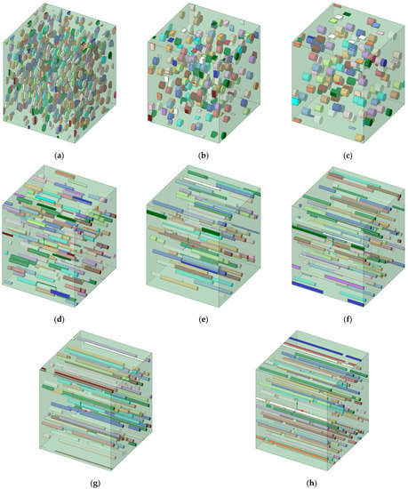 Finite element analysis model according to the aspect ratio of the UHMWPE fiber. (a) Aspect ratio 0.2, (b) Aspect ratio 0.6, (c) Aspect ratio 1.0, (d) Aspect ratio 6.0, (e) Aspect ratio 12.0, (f) Aspect ratio 18.0, (g) Aspect ratio 24.0, (h) Aspect ratio 30.0.