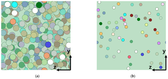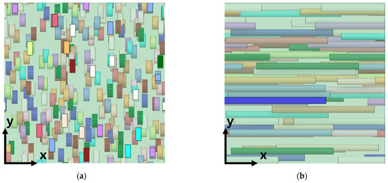 Furthermore, in this study, a finite element analysis was performed through the homogenization technique using ANSYS Material Designer. ANSYS Material Designer is a module that enables material design and analysis by modeling composite materials or micromaterials per unit square. Through this module, a finite element analysis was performed by modeling the composite material. This was accomplished by setting the volume fraction of fibers per unit volume to 5 VF% using the homogenization technique. Homogenization techniques have received increasing attention over the past decades for predicting the mechanical properties of composite materials. This is because homogenization techniques can efficiently quantify the interplay between microscopic and macroscopic properties [35,36,37,38,39,40,41]. In this study, the UHMWPE fiber was assumed to be a cylinder to predict the elastic properties of the composite material. It was modeled such that the UHMWPE fiber could be randomly arranged inside the Representative Volume Element (RVE) according to the aspect ratio. Owing to the finite element analysis setup using this homogenization technique, the diameter and RVE size of the modeled PP matrix and UHMWPE fiber may differ depending on the volume fraction. In addition, the orientation of the fibers was set in the x-axis direction (longitudinal) so that they could be oriented inside the PP matrix. The modeling shape is illustrated in Figure 2. The elastic behavior of the UHMWPE fibers was compared and analyzed based on the elastic properties calculated from the RVE according to the change in the aspect ratio. The physical properties of each material used in the finite element analysis are listed in Table 1. The properties used are those of a linear isotropic material, but these isotropic properties can be applied to an anisotropic material in the shape of the cylindrical UHMWPE fiber, which was modeled in ANSYS Material Designer. In terms of the physical properties, the PP was obtained by quoting PolyMirae Company’s Adstif EA5074, and the UHMWPE assumed the physical properties of Mitsui Chemicals’ MIPELON product. Although the densities of PP and UHMWPE are similar, the elastic and shear moduli are large, because of the chain structure characteristics of UHMWPE. However, UHMWPE is vulnerable to deformation owing to its low Poisson’s ratio. Therefore, if the two materials are effectively combined to form a composite, a good synergistic effect can be achieved.
