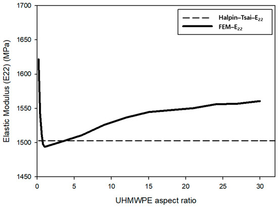 This study comparatively analyzed the behavior of elastic properties by aspect ratio of the ultra-high molecular weight polyethylene (UHMWPE) fibers that are added when creating a composite material of polypropylene and UHMWPE. The volume fraction (VF) of UHMWPE fibers added to polypropylene was fixed at 5%. The elastic properties were lumped for analysis according to the aspect ratio of the UHMWPE fibers oriented on the polypropylene matrix; they were analyzed using the Halpin–Tsai model, which involves a theoretical approach and finite element analysis based on the homogenization method. Finite element analysis was performed for fiber aspect ratios of 0.2 to 30 UHMWPE via the homogenization technique using the ANSYS Material Designer. For theoretical comparison, UHMWPE fiber aspect ratios of 0.2 to 100 were comparatively analyzed using the Halpin–Tsai model. When the aspect ratio of UHMWPE fiber was 0.2, it was calculated as 1518 MPa, and when the aspect ratio was 30, it was 2365 MPa, and it increased by 55.8%. As the aspect ratio increased, E22 and G12 converged to a constant value (1550 MPa). In the future, when the volume fraction of UHMWPE changes from 0 to 50%, a study must be conducted to analyze the predicted behavior of the elastic properties when the aspect ratio of the UHMWPE fiber changes.