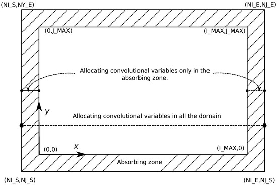 As previously mentioned, the CPML is implementable with a recursive sum in time, only in the absorbing region [31]; for this reason, we have two implementation options. Consider the variables implicated in the CPML as local in the absorbing region or the overall domain, simplifying the number of loops and variables but increasing the amount of memory used.
