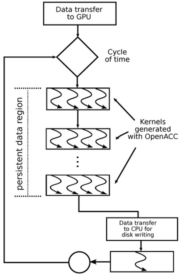 It is known that to get good performance with graphics cards, it is necessary to reduce the data transfers between the memory of the CPU and the GPU. Therefore, the essence of the strategy is to leave the persistent variables or data on the GPU. The directive for that purpose is acc data and is used to define a persistent region of data on the GPU. Any code included in the data region will keep persistent variables in the GPU without the need to transfer the variables themselves to the calculation region (kernel) only when they have to be recorded to disk, so it must be declared outside of the time cycle (see diagram in Figure 5).