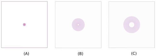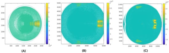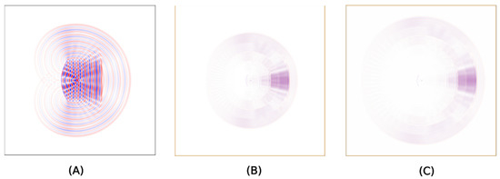 Snapshots of the electric field distribution () for the free space at 2.45 GHz frequency. (A–C) show the images at 150, 650, and 700 time-steps, respectively. The simulation was carried out during 1160 time steps.