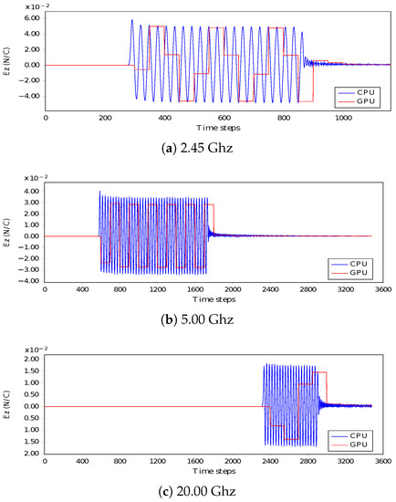 Comparison of the reference solution versus the solution obtained in the GPU (fastest in single precision) for 2.45 GHz, 5.00 GHz, and 20.00 GHz frequencies, using the MSE. The values used for the error calculation are transferred every fixed number of iterations, as shown in Figure 11.