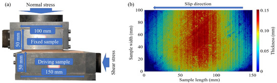 The sandstone surface was roughened with silicon carbide grit sandpapers. This can make the surface flat and give the surface the same roughness. The size of the upper sample in the slip direction was smaller than that of the lower sample to ensure the same contact area during fault block slip. Photographs and dimensions of the rock samples and photos of the 3D laser survey of the fault surface are shown in Figure 1.