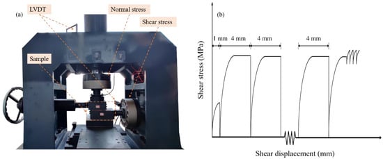 The specific test process is divided into two stages: the pre-loading stage and the formal-loading stage. During the pre-loading stage, a shear force preload is required to eliminate poor interlock between surface asperities and ensure the accuracy of the shear stiffness calculation. The specific steps of the pre-loading stage are to load the normal force to the target value and then load the shear force. After the shear displacement reaches 1 mm (Figure 2b), the shear and normal forces are unloaded. During the formal-loading stage, the normal force is first loaded at a loading rate of 0.5 KN/s. When this normal force is loaded to the target value, it remains constant, and then the shear displacement is loaded at a loading rate of 0.05 mm/s. Until the shear displacement at this stage reaches 4 mm (Figure 2b), the shear and normal forces are unloaded. When the force is completely unloaded, the second stage is repeated until an unstable slip occurs or the fault cumulative slip displacement reaches 41 mm.