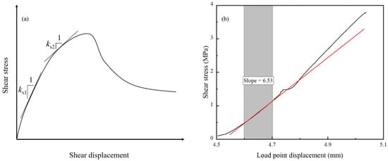 Shear stiffness is the ratio of shear stress to the corresponding shear displacement prior to reaching the peak shear strength. Figure 3a shows the calculation method of the shear stiffness, and the calculation formula is [56,57]: