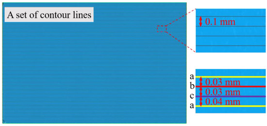 A test was carried out to select a suitable point spacing. As shown in Figure 4, the size of the fault surface is 100 mm × 150 mm, and the transverse direction is the shearing direction. The main step is to take three sets of contour lines along the shearing direction on the same fault surface. Each set of contour lines contains more than 950 contour lines. In each group of contour lines, the interval between adjacent contour lines is 0.1 mm. In different contour line groups, the distances between adjacent contour lines are 0.03 mm, 0.03 mm, and 0.04 mm, respectively. The point spacing on the contour lines is 0.03 mm, 0.05 mm, 0.1 mm, 0.3 mm, 0.5 mm, 0.7 mm, and 1 mm. Z2 and Z2s are calculated according to the coordinates of the point.
