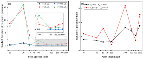 Figure 5. Roughness parameter calculation results. (a) Standard deviation of roughness parameters calculated by taking into account points with different point spacings for three groups of contour lines. (b) Ratio of average values of different roughness parameters of fault surfaces which were roughened with #60 and #1000 sandpapers.