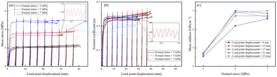 As shown in Figure 6a,b, when the normal stress is 3 MPa, the slip is stable throughout tests. When the normal stress is 5 MPa, two groups of tests produce unstable slip when the slip displacement reaches 29 mm and 33 mm, respectively, while the third group of tests does not produce unstable slip. When the normal stress is 7 MPa, the three groups of tests produce unstable slip when the slip displacement reaches 21 mm, 26 mm, and 27 mm, respectively.