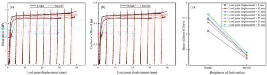 Figure 7a,b shows that when the rough surface is used for shear tests, two groups of tests produce unstable slip when the slip displacement reaches 29 mm and 33 mm, respectively, and the third group of tests does not produce unstable slip. When the smooth surface is used for the shear tests, one group of tests produced unstable slip when the slip displacement reached 37 mm, and the other two groups of tests maintained stable slip during the whole shearing process. The more unstable slip occurs on the rough surface, but this does not mean that the rough surface is more prone to unstable slip. The slip displacement is similar when two kinds of surface tests produce unstable slip.
