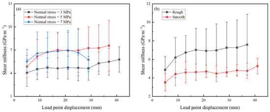 Figure 8. Test results with different slip displacements. The average value of the repeated test results is each data point, and the standard deviation is the length of error bar. (a) Trend of the average shear stiffness with the slip displacement under different normal stresses. (b) Trend of the average shear stiffness with the slip displacement under different roughness of the fault surfaces.