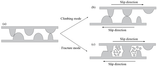 Figure 9. Two asperities interaction modes. (a) The state of the asperities before the slip of the fault block. (b) Climbing mode: When the normal stress is small, the asperities will not break. The friction behavior is mainly dominated by the overriding/climbing between the asperities. (c) Fracture mode: Fracture of the asperities occurs due to large shear stress when the normal stress is large. Fracture mode associated with the production of fault gouge [15].