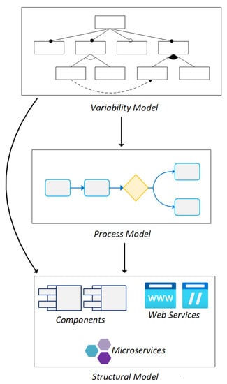 The proposed methodology, MSDeveloper supports the development of software systems in a top-down approach. This approach is suggested with a layered model, where the process model is the model at the top layer and the structural model is at the bottom layer []. Both process and structural models are compliant with the variability model. The process model located at the higher level and the web services at the bottom level point to the de facto architecture in SoA. Additionally, conventional development based on UML starts with the functional dimension modeled with the use case diagrams. These widely practiced approaches, along with our research, suggest a model hierarchy where processes are at the top []. Rather than organizing our architecture based on structural components, such as GUI and data, etc., we prefer to process the top-level model, followed by the low-level executional models, which are microservices. These lower-level units also accommodate data structures to account for the data dimension. Following our discussion in the introduction related to genericity, fundamental design dimensions are considered in the shaping of the proposed reference architecture in Figure 1.
