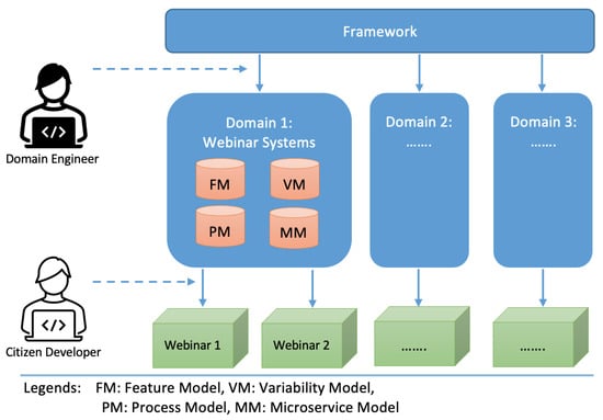 This article reports on our ongoing work, which offers graphical modeling environments for an example application domain (Webinar System) and supports the development of products without code writing once the developers refine their set of graphical models (Feature, Variability, and Business Process models) and Microservice Domain Model in conformance with each other. A two-layer architecture is proposed for accommodating these models, corresponding to the run-time environment.
