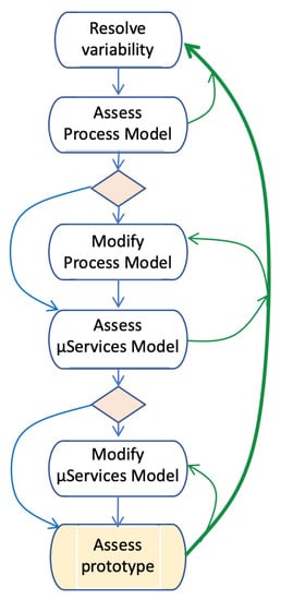 Consistency is an important criterion for both domain engineering and product engineering outcomes. As stated above, variability resolution and related constraints propagate through all the models, which supports the consistency of the output. After variability decisions, which are handled as a product engineering phase, the temporary outcome in the process and the microservice models can be reviewed. Until the desired consistency is achieved, the developers can iterate through the activities of variability modifications and processes and microservice model inspections and modifications.