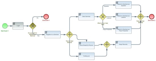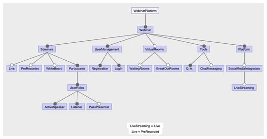 We introduced the development setting to the developers before sharing the experimental webinar system domain. The shared feature model, which takes place in the shared workspace, is depicted in Figure 5, the shared variability model (which automatically performs all the controls regarding the features and constraints) is represented in Figure 6, and the shared BPMN model is shown in Figure 7.