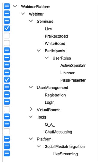 We asked developers to enrich the webinar system domain with optional and mandatory features to develop it towards a mature domain. The participants added the features they deemed necessary and enhanced the feature model by defining the constraints among the features. In this stage, they were able to perform visual modeling by using the drag-and-drop capability of the framework. Then, they prepared the variability model through support from the facility provided by the framework. A representation of the variability model is shown in Figure 6. After that, they prepared the base and the partial BPMNs for each optional feature.