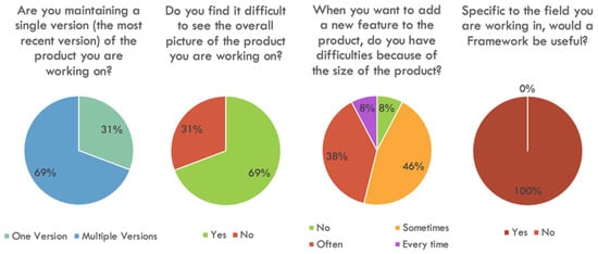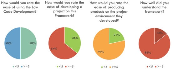 We can deduce from the following results stated in Figure 8 that half of the participants who have never developed in a low-code development environment do not find this environment very easy. On the other hand, it is seen that 64% of the participants have a positive opinion about the framework that we have prepared. Moreover, 86% of respondents think that they understood the framework well. This is encouraging feedback that suggested that we were able to explain our methodology and tools to the participants well. We see that after the domain-oriented development processes, 79% of them find it easy to generate the products through different configurations corresponding to low-code development.