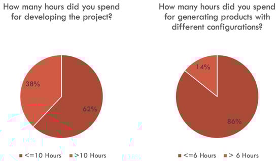 One of the things we were most curious about during the experiment was the time spent. The answers we received to the questions we asked for this purpose are given in Figure 10. A total of 62% of respondents said they spent less than or equal to 10 h developing their webinar system domain. When generating the products with different configurations, 86% explained that they spent less than or equal to 6 h. We inferred that the time spent here is due to an immature domain because the framework completes the creation process of products developed in different configurations in milliseconds. However, the participants, who probably did not have a chance to develop a mature domain, encountered errors, corrections, etc. So, this step may have taken a long time.