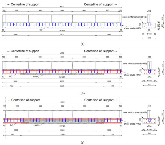 The thickness of the bridge deck of the scale specimen was 200 mm. In order to make the UHPC layer participate in the structural force, its layer thickness must be greater than 40 mm (i.e., the layer thickness ratio must be greater than 20%). Thus, three types of UHPC layer thickness ratios (UHPC layer thickness to deck thickness) were designed: 30%, 60%, and 100%. At the same time, one specimen with a bridge deck only using regular concrete (i.e., UHPC layer thickness percentage of 0) was designed. The specimens were grouped as shown in Table 1 and Figure 3a–d, respectively. Additionally, contact surfaces were roughened before pouring the UHPC, and reinforcements were arranged to prevent the slip in the contact surfaces (as shown in Figure 3) to guarantee the contact behavior between UHPC and RC.