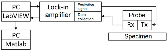 The output of the Lock-in amplifier is connected to a PC, using a measuring card on which both analogue and digital inputs and outputs are used. The collection of measured data is carried out on a PC using the LabVIEW program. In LabVIEW, 1000 samples with a sampling frequency fs = 10 kHz are read from the detected signal of one frequency. The algorithm is set so that for each frequency, the collection of the given amount of data is ensured using appropriate synchronization. The specimen values for the real and imaginary components of the induced voltage are averaged and then saved in files. Mathematical operations are subsequently implemented in the Matlab environment. Figure 1 shows a block diagram of the connection of the measuring apparatus.