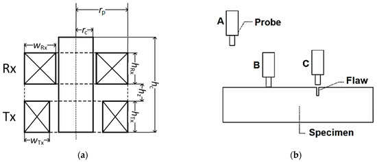 A probe with a ferromagnetic core is used to measure corrosion cracks, Figure 2a. In addition to being placed above the crack, the measurements are also performed on the material without a crack and a separate probe in the air, Figure 2b. The two-coil SFECT probe is used. The first coil generates the electromagnetic field by acting as a transmitter (Tx). The second coil, often known as the receiver, is utilized to detect the response signal (Rx). Table 1 displays the probe’s dimensions.