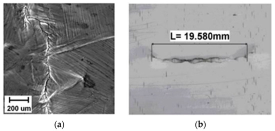 Material specimens used for the experiments are made of stainless steel, marked AISI 316L (austenitic stainless steel, without titanium stabilization, low Carbon content). The plates are all the same thickness, h = 10 mm. The width of the plate is w = 115 mm, and the length is l = 200 mm. Each plate contains a corrosion crack, Figure 3.