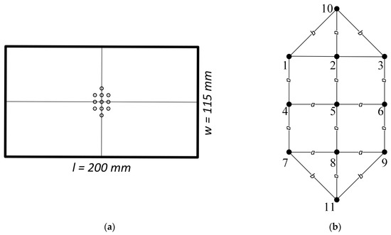 Because with real cracks, it is not possible to determine the exact position or dimensions of the crack, it is necessary to define the area of interest in which the measurements will be made, Figure 4a. The area that is delineated consists of various measuring points where measurements are carried out step by step because the SFECT method uses a statically located probe. Eleven measurement points are chosen for measurement, which creates a regular measurement network. The distribution of points is shown in Figure 4b.