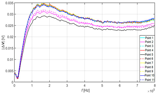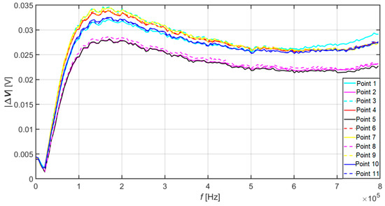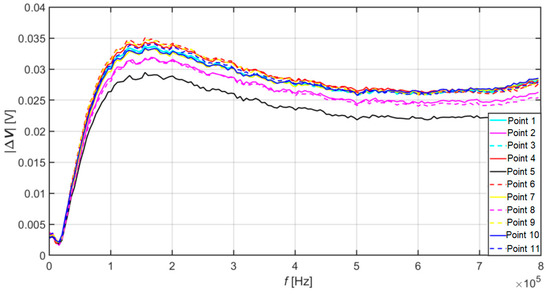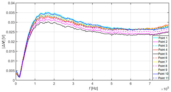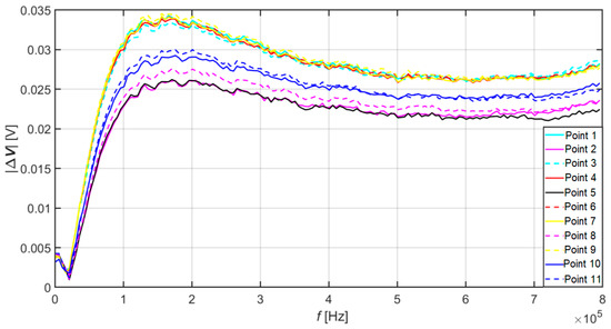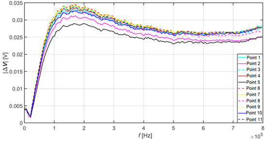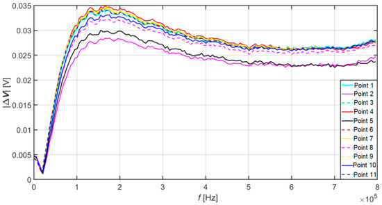 From the results plotted in Figure 7, it is also possible to see that the value of the signal from point no. 1 dropped to the maximum level of point no. 10, which is the assumption that corrosion is spreading in this direction. In the area of higher frequencies, however, it rose compared to other values. This phenomenon can indicate either the absence of a crack at this point on the surface or just below the surface of the material specimen. Or the presence of another discontinuity in the material.