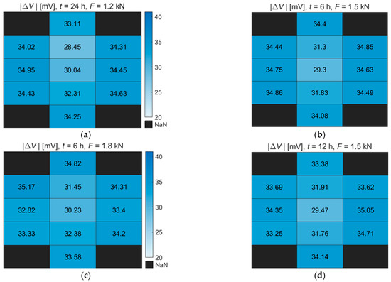 Figure 12b shows the map of the maximum values of Specimen 2, and Figure 12c shows the map for Specimen 3. Both specimens were in the corrosion solution for the same time t1 = 6 h. The specimens differ in the force applied to the specimen in the solution. In Specimen 2, the signal from point no. 5. At this point, corrosion has most affected the structure of the material. From the drawing of the map of Specimen 3, the corrosion affected a larger area but with less intensity than in Specimen 2.