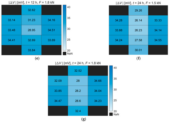 The results from Specimen 4, Figure 12d, show the spread of the crack in the direction of points no. 10 and no. 11. On Specimen 7, Figure 12g, the effect of corrosion is visible in points No. 2, No. 5, and No. 8. However, it is clear from the map that the crack partially extends into the areas of points No. 1, No. 10, and No. 11.