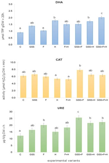 Changes in DHA, CAT and URE activity after GSS and herbicides (MCPA/dicamba) and fungicides (thiophanate-methyl/azoxystrobin) application. (The same letters above bars mean non-significant differences between treatments estimated by Tukey post hoc test at p < 0.05).