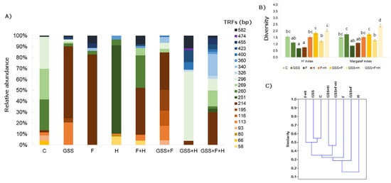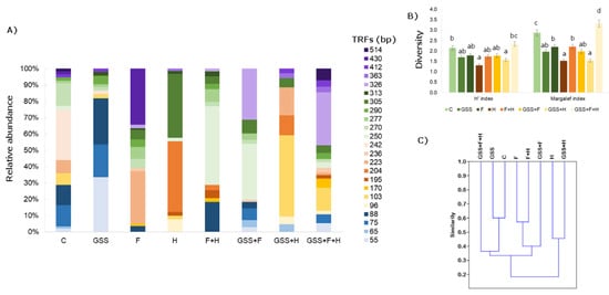 (A) Relative abundance (%) of bacteria TRFs fragments after MspI digestion; (B) Shannon (H′) and Margalef diversity indexes and (C) dendrogram presenting Jaccard similarity index (C). The data presented in (B) are means ± SD; the same letters mean non-significant differences between treatments assessed by Tukey post hoc HSD test at p < 0.05.