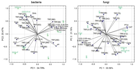 PCA analysis presented as BiPlot. Factor coordinates of cases represent the analyzed properties of soil and TRFs defined for bacterial and fungal community; factor coordinates of variables represent the research variants.