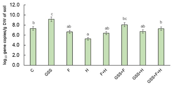 The abundance of amoA gene copy number (log10 gene copy numbers/g DW of soil) in the soil samples collected for experimental plots. The data are presented as means ± SD; the same letters mean non-significant differences between treatments assessed by Tukey post hoc HSD test at p < 0.05.