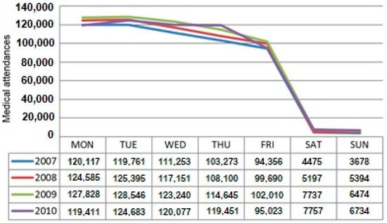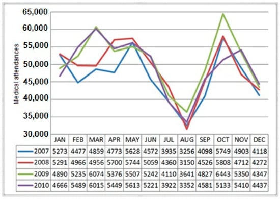 This study focuses on the last issue, with the objective of designing a model to accurately predict the number of medical attendances which primary healthcare services deal with each day. In this work the methodology of the work necessary to generate the prediction model for a particular city is described. This methodology can be applied to other geographical areas. Firstly, to search for the main factors related to common diseases. Authors mentioned above analysed environmental and meteorological ones. This study is the first to approach modelling this relationship to a high level of precision. For this reason, data have been selected for a specific city and one primary healthcare clinic. Ellis and Jenkins 2012 [] highlighted in their research how weekdays affect the attendance rate of medical appointments on a large scale. Considering this, the medical attendances at primary healthcare centre on weekdays, months and years, but on a small scale were also used. Additionally, the daily environmental data, such as minimum, mean and maximum temperatures, rainfall, and humidity were also considered. Levels of pollution were considered as well. This is another factor that affects health and provokes an increase in visits to the doctor, Oiamo et al., 2011 []. Other research in medicine has used data mining and regression models in order to analyse issues related to clinical medicine and/or access points at the different levels of health care [,].