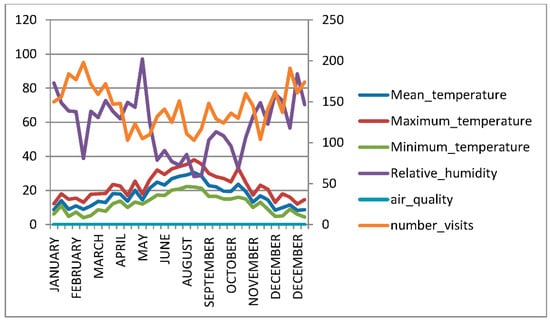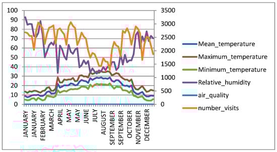 The primary data were the date and the number of medical visits, as well as the meteorological data. When analysing Figure 2, the behaviour of the visits was very different for each day of the week (Monday, Tuesday, Wednesday, etc.), which is why the date is denoted as follows: