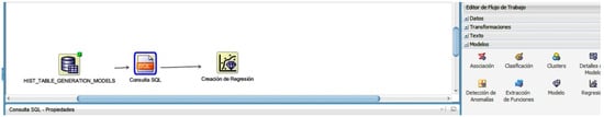 On the right side of Figure 6 the data mining models can be chosen, tables of origin, etc. On the left there is the area where the elements can be dragged that form part of the predictive model (in this case the source of Table 3, an element of the type of query SQL and the regression model). Finally, to generate the model the user only needs to click on run.